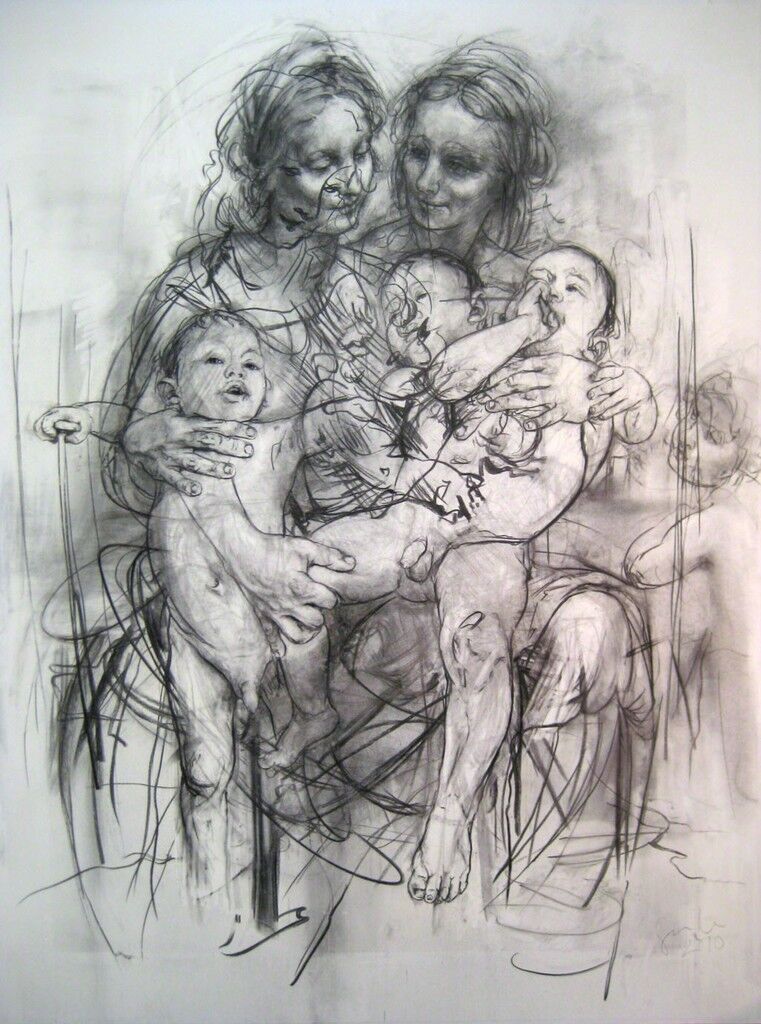 This is Reproduction Drawing IV is a paper and pencil artwork made by Jenny Saville. It was created in 2009-10 and is held in the Gagosian Art Exhibit. This piece is a part of a series of pieces called the reproductive drawings.In creating this, she mimics Leonardo's Madonna and Child with St. Anne and Virgin and child with St. Ann and St.John the Baptist. Jenny Saville takes the human form and makes it look as if it is moving within these drawings, the child being depicted looks tangled within its mothers arms as a small child would be naturally.