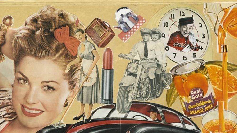 This is Eduardo Paolozzi's "Living in a Materialist World". This piece is at the Pallant House in Chichester, West Sussex Britain. In this artwork Eduardo is attempting to poke fun at the post-war consumer society. To make this he uses mixed media of newspaper and magazines in a surrealist fashion. I was attracted to this piece of artwork because I am a materialist type of person even though it is considered a negative trait. The bright ads of perfection displayed what materialism meant back in the day, being a shinier looking human with a house full of new gadgets to show to your neighbors. He really captures the happiness the ads show with all these new daily inventions we use even today.